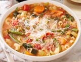 Large bowl of homemade Italian vegetable soup with pasta shells. Topped with a sprinkle of Parmesan cheese.