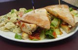 Grilled chicken breast, lettuce, and parmesan cheese with Caesar dressing. Served on pizza bread and side of pasta salad.