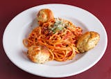 Classic, hearty pasta with our thick, our homemade marinara, topped with grated Parmesan cheese. Served with 3 pieces of garlic knots.