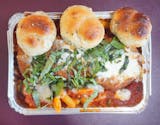 Sautéed onions, peppers, zucchini, tomatoes, and eggplant with extra virgin olive oil. Served on our homemade pizza bread with a side of pasta salad.